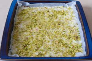 شکل سنتی این شیرینی خوشمزه، لوزی شکل است اما شما با توجه به سلیقه و ظرف سروتان میتوانید آن را قالب بزنید یا به شکلهای مربع یا مستطیل برش بزنید. حتی میتوانید مخلوط را به شکل توپک در بیاورید و در پودر پسته بغلتانید.